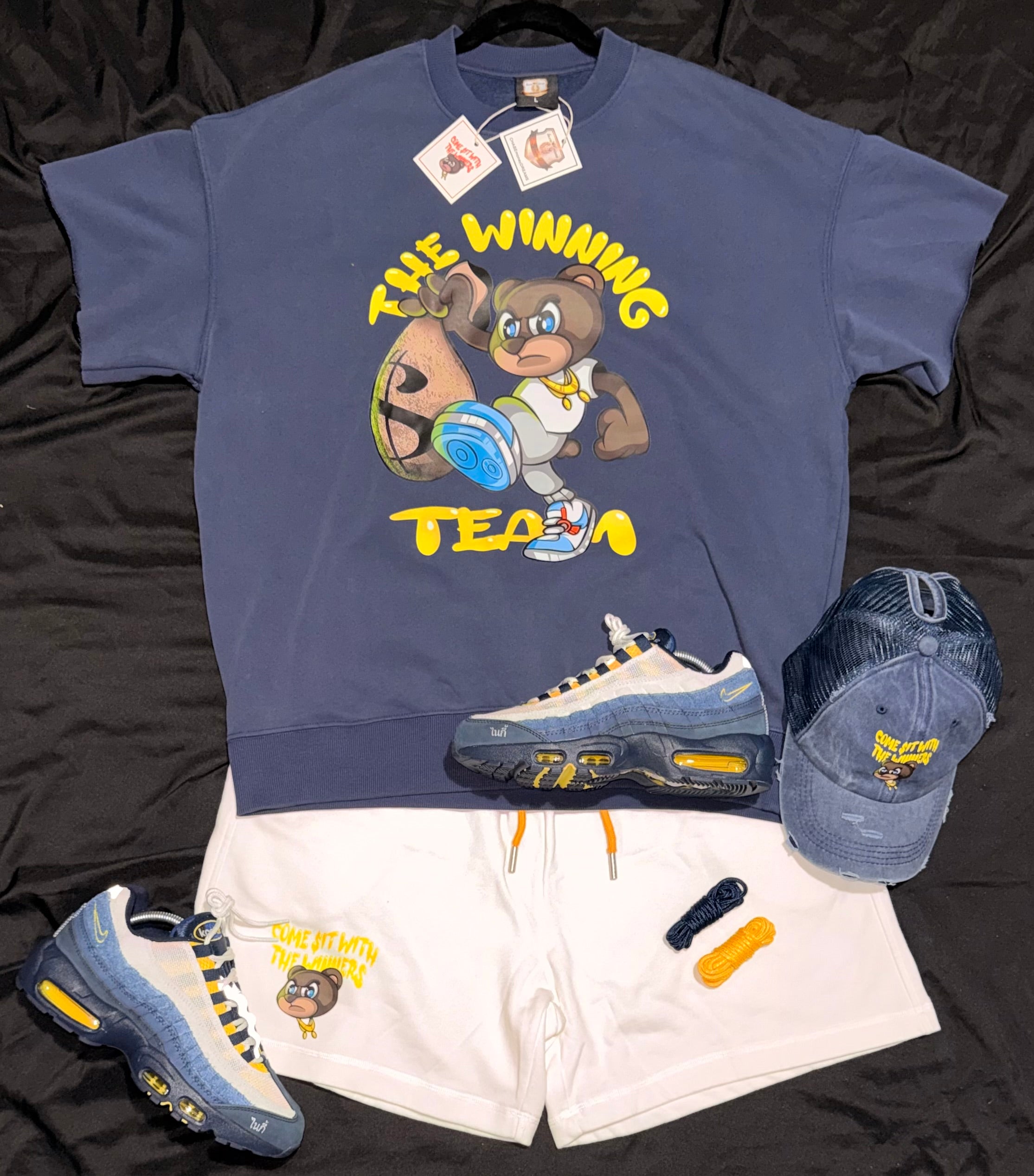 🏆THE WINNING TEAM🏆 line gives you a restart to fashion. This stylish navy/maize and white, hat, sweater and shorts set features top quality soft and comfortable cotton. With a unique graphic design, perfect for active wear, a day with the family or a casual night out. Made with quality materials for comfort and durability. Luxurious Lifestyle Creationz brings you the best in class and comfort. For your daily life style. (Shoes are not included.)